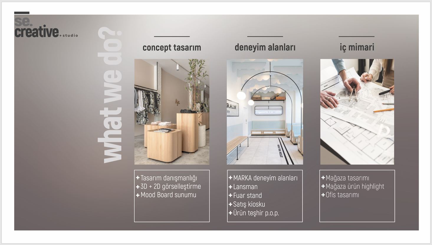 Se creative studio; , kurumsal ve kentsel ölçekte yaşam alanlarını ve bu alanlarda oluşan deneyimleri tasarlamak heyecanı ile 2020 yılında 20 senelik deneyimi think box’ına koyarak, yaratıcılıkla daha iyi deneyim ve his bırakmak için kuruldu.